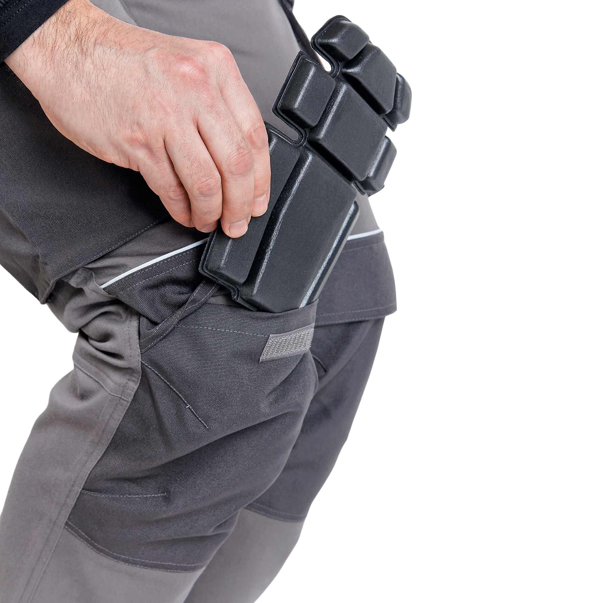 - tasca inclinata sulla gamba sinistra con doppia tasca per il cellulare con patta per una personalizzazione facile
